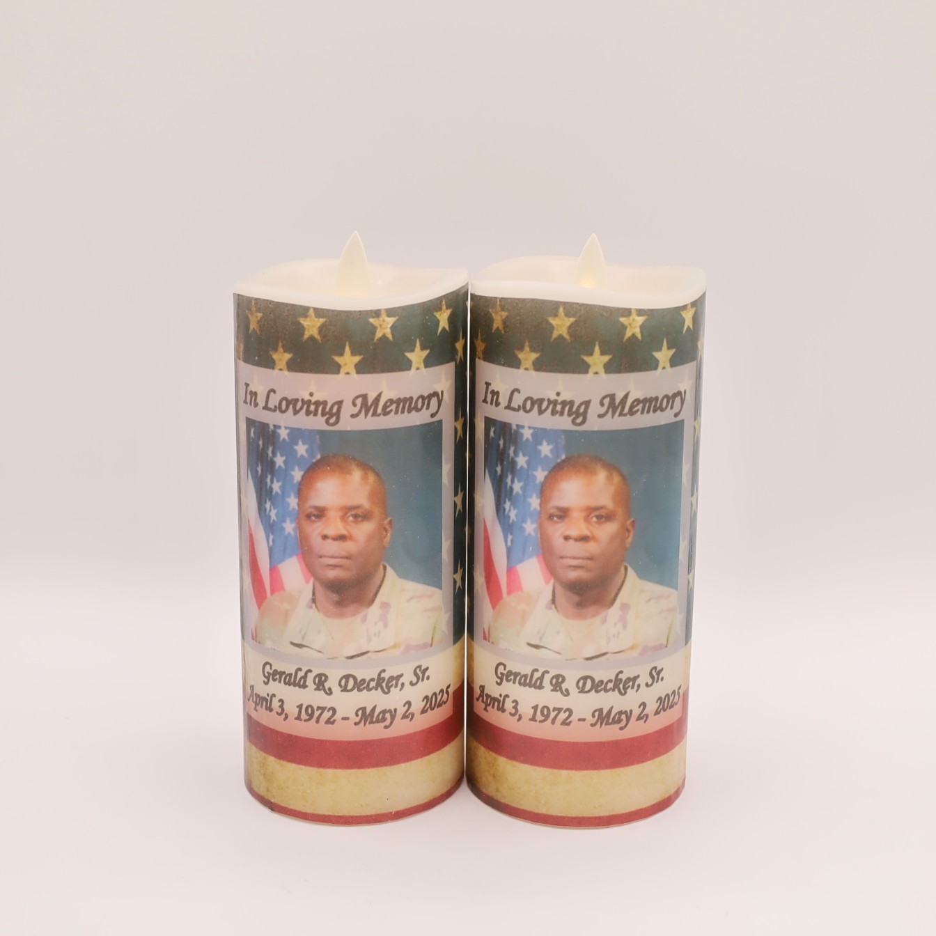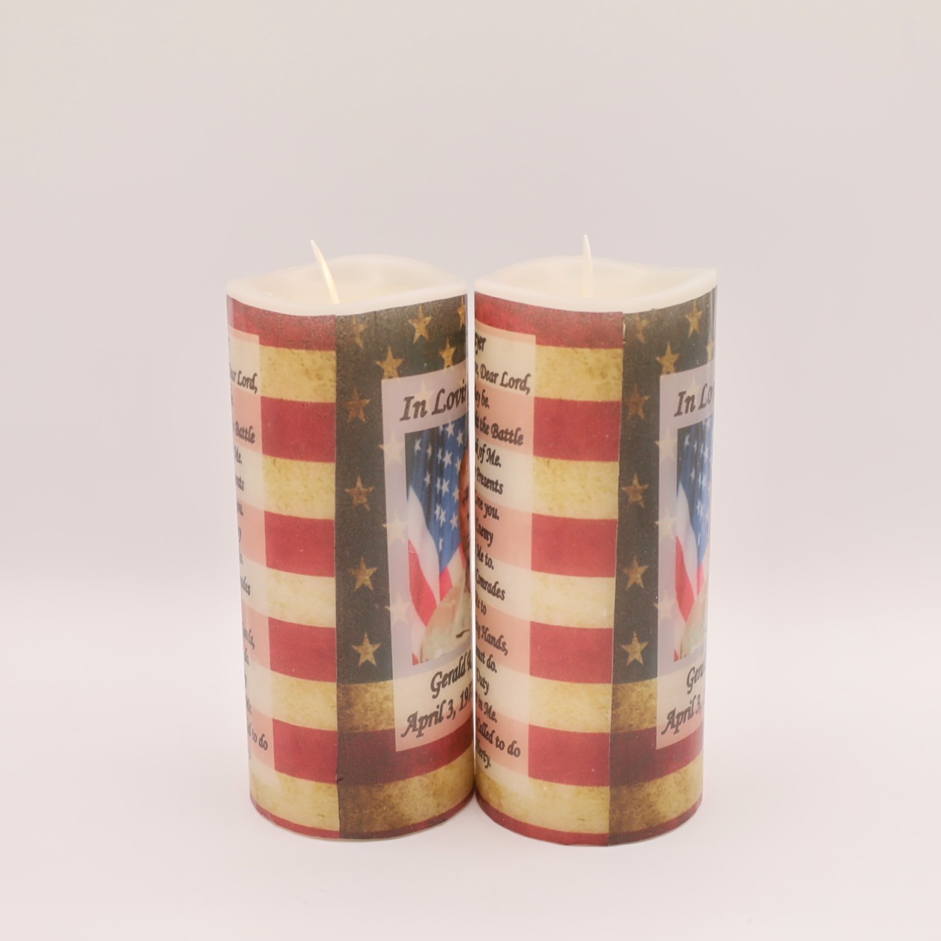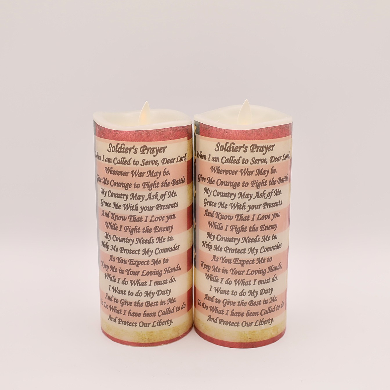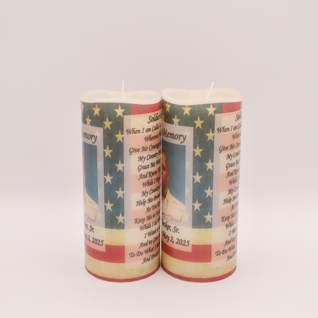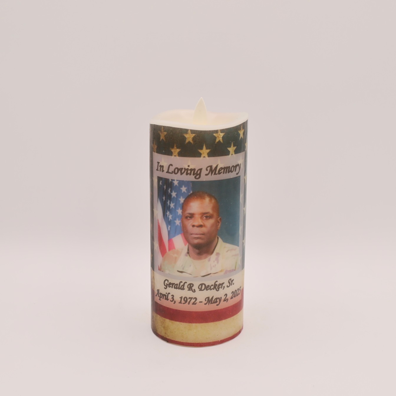 This real wax flameless candle offers a long lasting and meaningful way to honor a departed veteran. The back showcases “The Soldiers Prayer”.